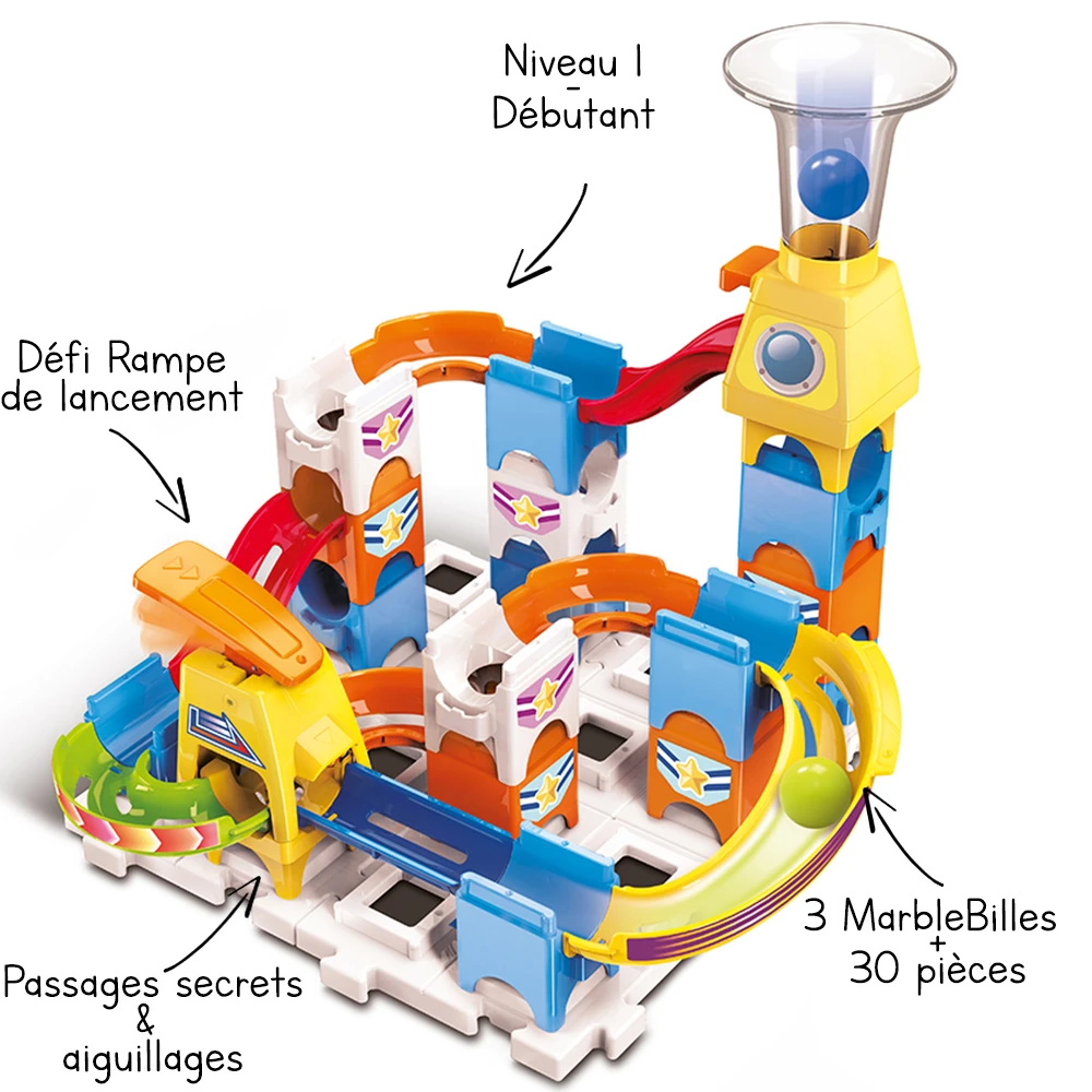 Votre enfant construit son parcours et lance les MarbleBilles pour les voir en mouvement continu et être projetées par le lanceur ! Différents passages secrets et aiguillages ajoutent de la surprise au jeu. L’enfant développe sa motricité, sa créativité, sa logique et son imagination en créant des combinaisons à l’infini.