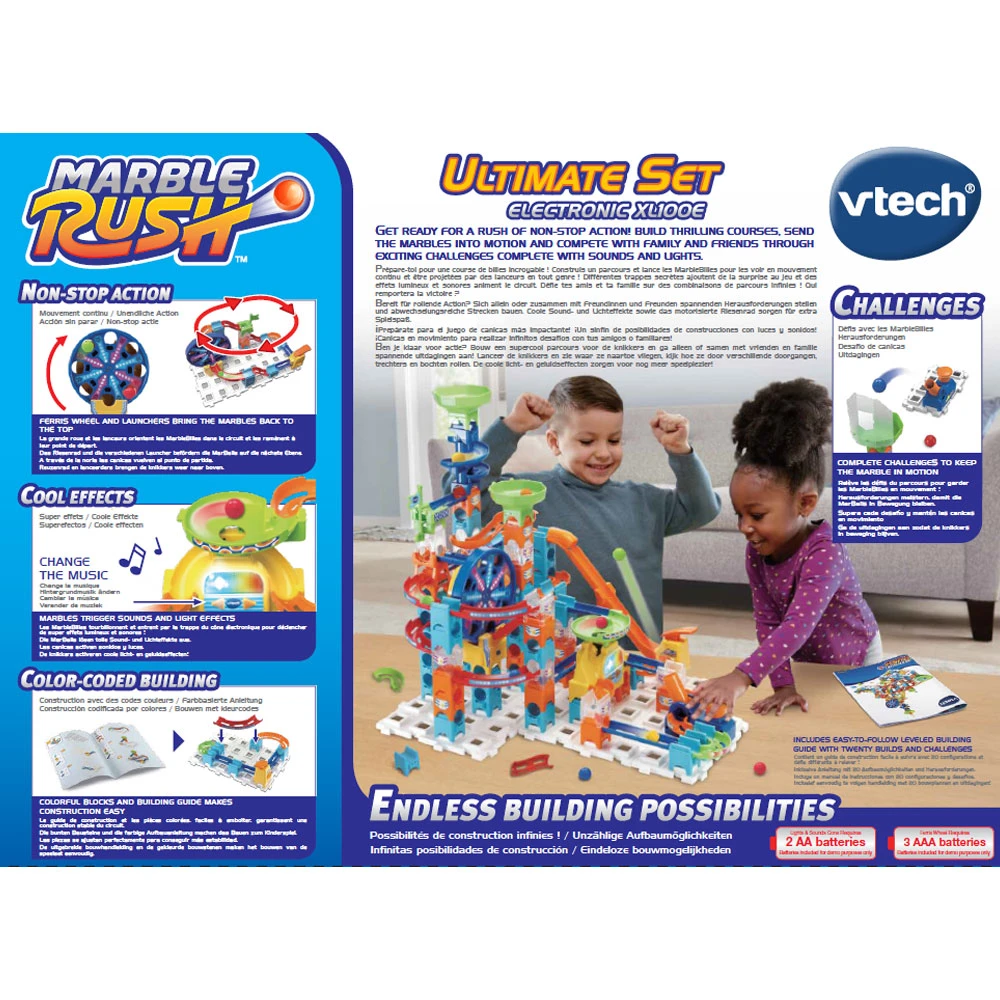 Votre enfant construit un super parcours et lance les MarbleBilles pour les voir en mouvement continu et être projetées par des lanceurs en tout genre ! Différentes trappes secrètes ajoutent de la surprise au jeu et des effets lumineux et sonores animent ce circuit à billes VTech.