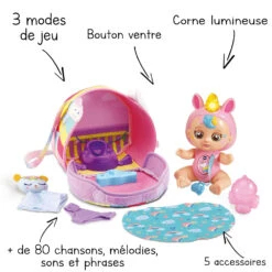 - Un bouton lumineux en forme de visage rigolo déclenche une chanson, des phrases et des effets sonores.
