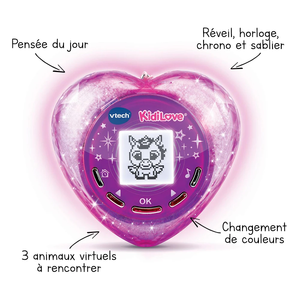 Le KidiLove est un coeur lumineux rempli de surprises ! Il suffit de le secouer pour entrer dans un monde magique ! Dès 5 ans, votre enfant pourra faire la connaissance d’un nouveau compagnon virtuel avec qui s’amuser, partager sa pensée du jour, écouter de la musique… et pourra même utiliser son KidiLove comme super réveil à emporter partout !