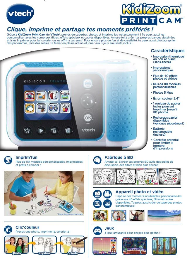 Votre enfant peut aussi créer ses propres bandes dessinées et les imprimer pour les colorier ou les offrir à ses amis ! Il peut également photographier des panoramas, faire des selfies, se filmer en pleine action et jouer aux 3 jeux amusants inclus.
