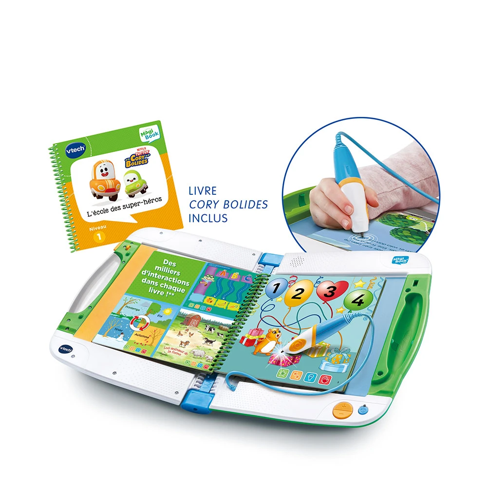 Le principe : votre enfant insère un livre MagiBook dans son lecteur (« starter pack ») et le découvre prendre vie grâce au stylet ! En touchant n’importe quel endroit de la page, des jeux, des phrases, des sons ou des chansons se déclenchent.