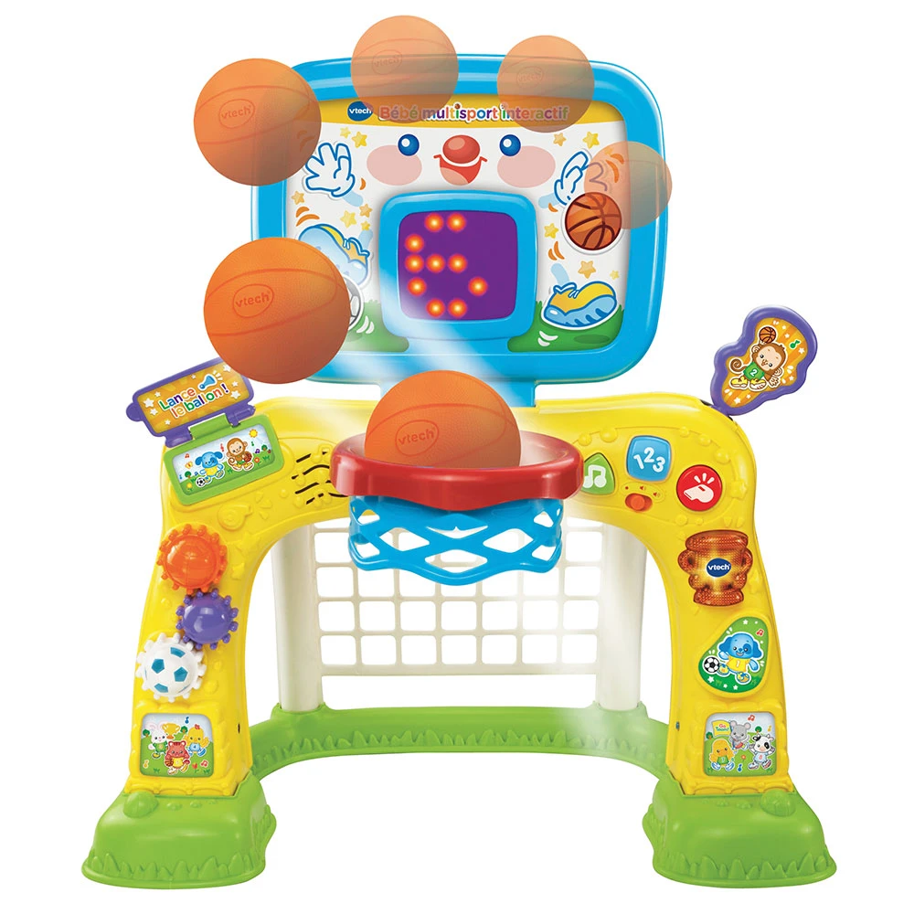 Avec Bébé multisport interactif, votre enfant découvre les formes, les premières lettres de l’alphabet et compte jusqu’à 10 en marquant buts et paniers.
