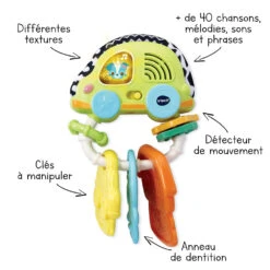 - Trois boutons interactifs : Appuyer pour déclencher des chansons, des mélodies, des phrases et sons de la nature.