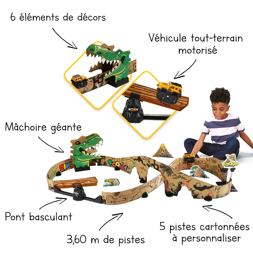 Dans ce circuit de 3,6 m sur la thématique des dinosaures, le véhicule tout-terrain motorisé avance tout seul sur les arêtes des cartons, en franchissant les obstacles sur son chemin ! Pont-basculant, décors destructibles, mâchoire géante de dinosaure … rien ne l’arrête !