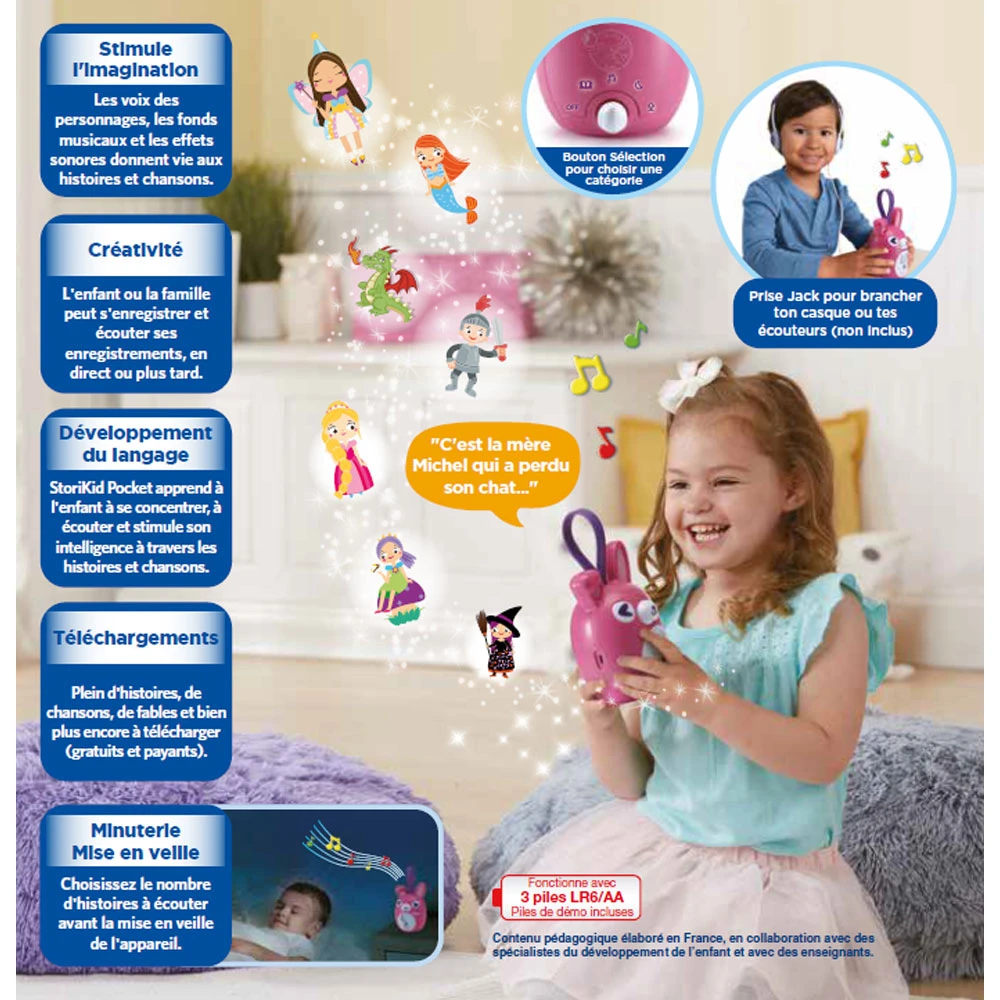 - Votre enfant découvre plus de 3h30 d’écoute réparties en histoires, chansons, histoires du soir et blagues ! le bouton Sélection à l’arrière du StoriKid Pocket permet de choisir la catégorie souhaitée.